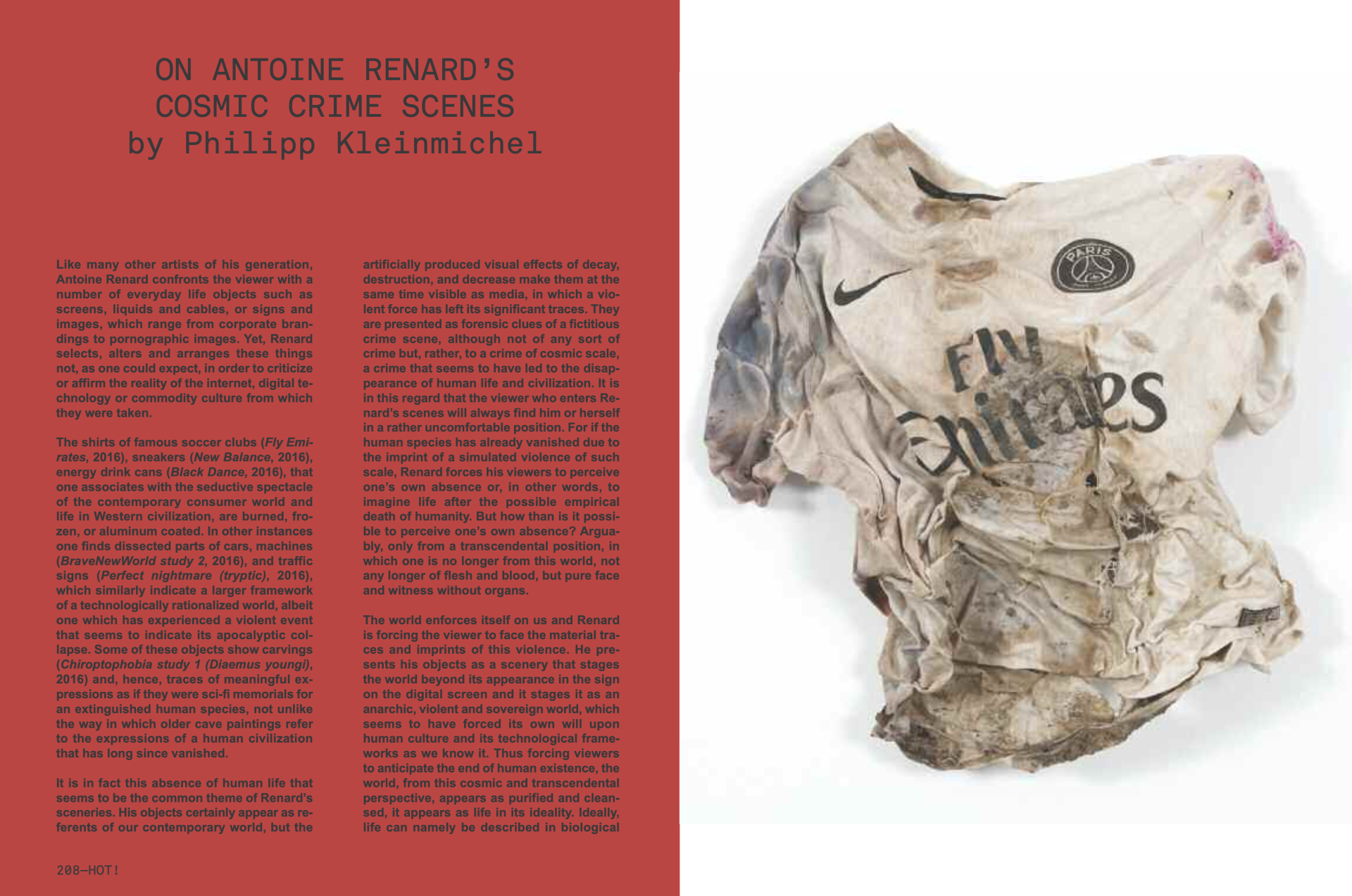 Les maillots de clubs de football célèbres (Fly Emirates, 2016), les sneakers (New Balance, 2016), les canettes de boissons énergétiques (Black Dance, 2016), que l’on associe au spectacle séduisant du monde consumériste contemporain et à la vie dans la civilisation occidentale, sont brûlés, congelés, ou recouverts d’aluminium. Ailleurs, on trouve des parties disséquées de voitures, des machines (BraveNewWorld study 2, 2016) et des panneaux de signalisation (Perfect nightmare (tryptic), 2016), qui indiquent eux aussi un cadre plus large de monde technologiquement rationalisé, tout en ayant subi un événement violent semblant annoncer son effondrement apocalyptique. Certains de ces objets portent des incisions (Chiroptophobia study 1 (Diaemus youngi), 2016) et donc des traces d’expressions signifiantes, comme s’il s’agissait de mémoriaux de science-fiction pour une espèce humaine éteinte, à l’image des peintures rupestres qui renvoient aux expressions d’une civilisation humaine disparue depuis longtemps.
