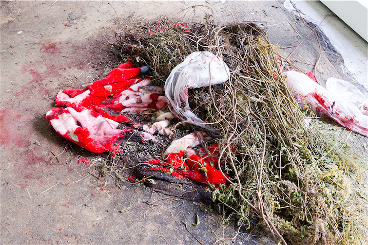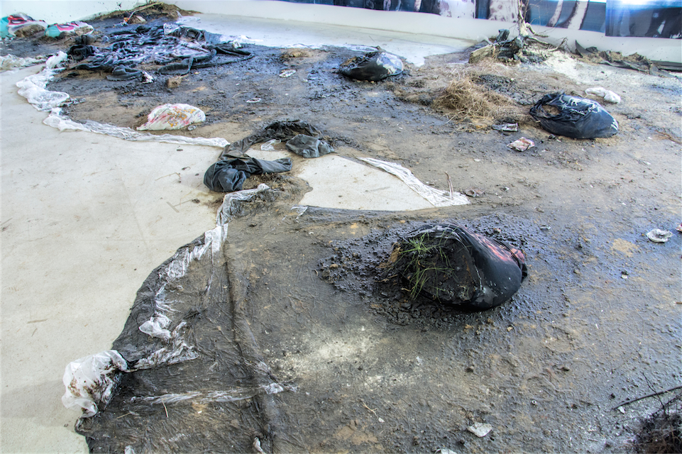 Soil, tar, plants, junk, various objects and materials, variable dimensions. |